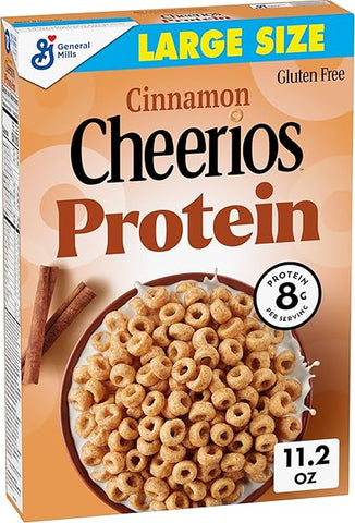 Product Description: Cinnamon Cheerios Protein treats you and your family to an O-so-delicious taste with 8g of protein per serving. This sweetened oat and pea protein cereal delivers satisfying cinnamon flavor in every bowl. Each serving of this gluten free cereal contains 12g whole grain (at least 48g recommended daily), with no artificial colors or flavors. Keep a Large Size box of this protein cereal made with whole grain in your pantry for part of a quick breakfast. Try some with or without cold milk as a snack in the morning or after school. Sprinkle some over Greek yogurt as a crispy addition to breakfast on the go. However you enjoy Cheerios Protein, General Mills cereals spread goodness from tots to grown-ups.